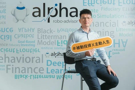 為了把這些投資理念在台灣落實,我們經過金管會的核准,建立了「阿爾發機器人理財」平台,希望在台灣有個金融機構能夠以被動投資為核心,幫助忙碌、不擅理財的朋友,有一個容易開始、省時的線上服務。