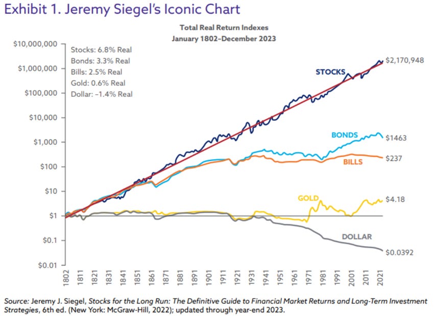 許多投資人認為黃金能夠長期保值,甚至帶來可觀的實際回報。然而,從 1802 年到 2023 年底的數據顯示,黃金的總實際回報指數(經通膨調整後)僅為 0.6% 的複合年化實際回報率。