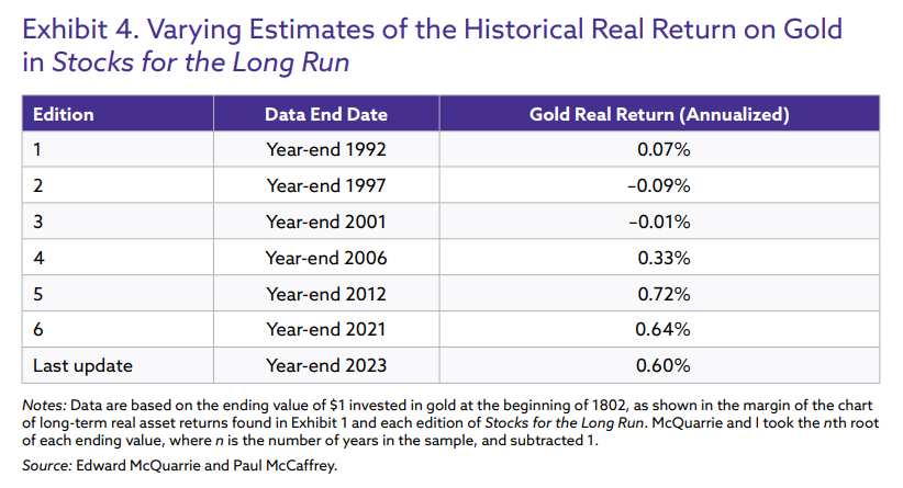 這種估計上的巨大差異(從 -0.09% 到 0.72% 不等,取決於數據截止日期)讓愛德華·麥夸里(Edward McQuarrie)等學者質疑,是否能夠以任何程度的確定性來描繪黃金數百年來的回報率。