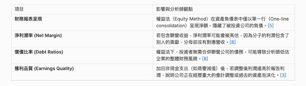 雖然這在利潤表中增加了獲利,但它是「投資收益」而非「營業收入(Sales)」。在計算營業利潤率時,如果不扣除這筆錢,分子的利潤包含聯營收益,但分母的營收卻沒有合併聯營公司的營業額,會導致比率被扭曲。