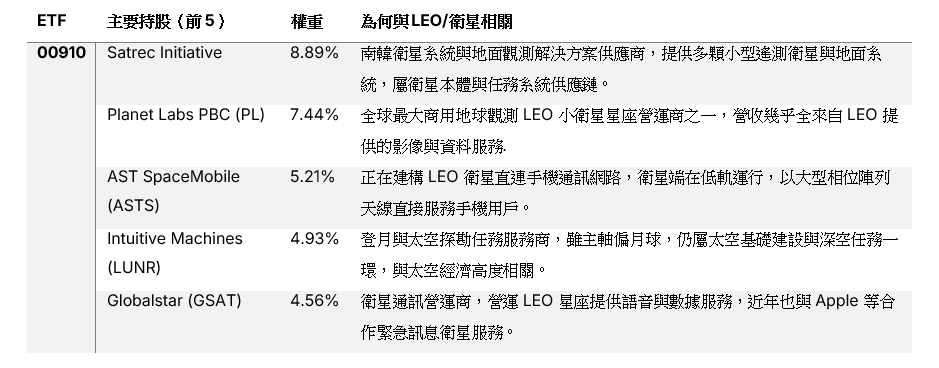 00910 的優勢是新台幣計價、台灣交易與配合本地制度;其指數由 Solactive 編製,前 10 大成分股幾乎都是衛星營運或關鍵供應商,題材純度高。