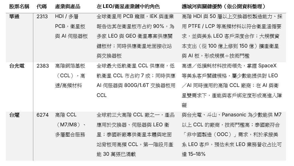 例如台光電、台燿(AI + LEO 共用相同高階 CCL 技術)、華通(AI 伺服器板+衛星板雙軸)、光聖(資料中心光纖+低軌衛星毫米波)。