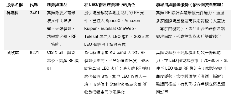 RF 載荷與前端:昇達科(3491)提供高頻 RF 元件;同欣電(6271)供應 KU band 衛星端 RF 模組。
