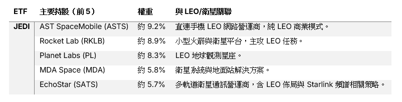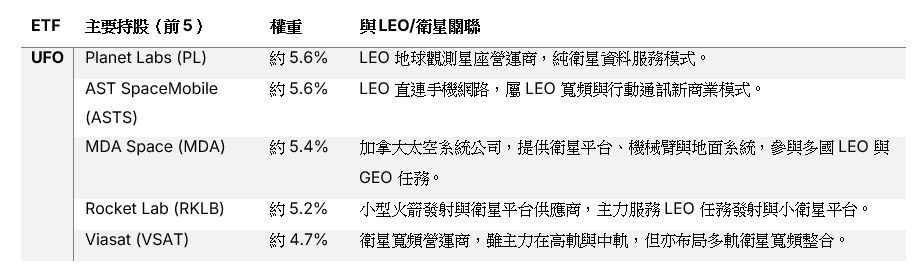因此其前十大持股結構與 UFO 類似(Planet Labs、Rocket Lab、ASTS、MDA、SES 等),LEO 與衛星通訊純度亦相近。