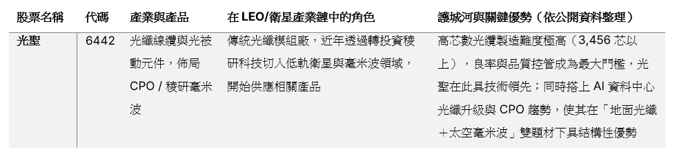 光通訊/雷射鏈路:光聖(6442)透過轉投資稜研科技切入毫米波與低軌衛星領域。