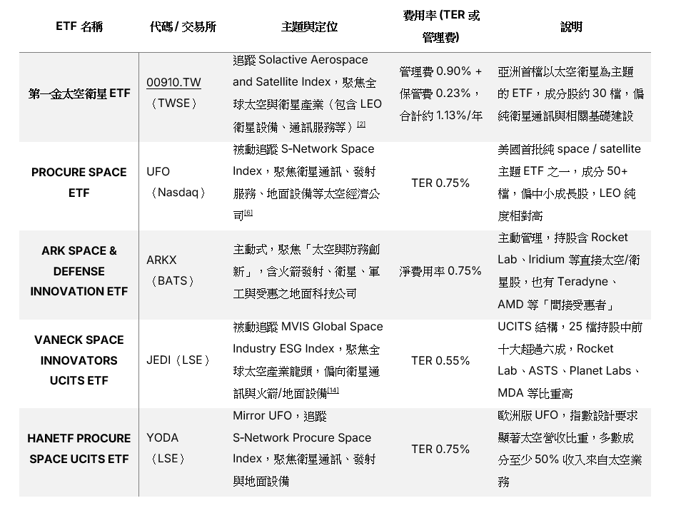 若追求全球 LEO/衛星純度且偏被動,可優先研究:00910、UFO、JEDI、YODA;ARKX 則偏向「太空+防務+相關科技」,適合作為「太空+成長科技」的混合暴露。
