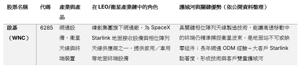 地面站天線與終端:啟碁(6285)提供相位陣列天線與家用/車用終端,是 Starlink 等 LEO 網路地面設備關鍵供應商。