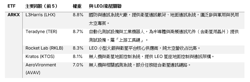 ARKX 為主動式 ETF,組合介於純太空與廣義「太空+防務+相關科技」之間。