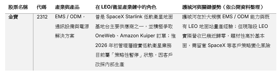 系統整合與代工:金寶(2312)曾為 Starlink 地面基地台主力 OEM,目前雖暫停 LEO 產能,但保留相關工程與製造能力。