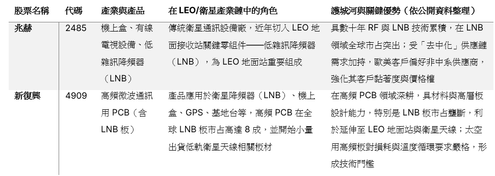 地面 RF 前端:兆赫(2485)與新復興(4909)在 LNB 與高頻板有優勢,對 LEO 地面接收站極為關鍵。