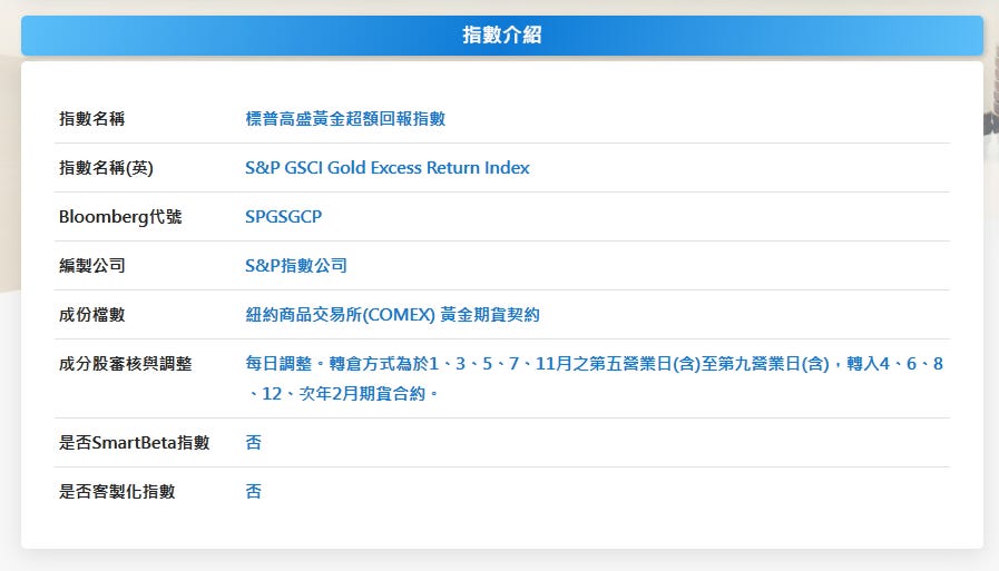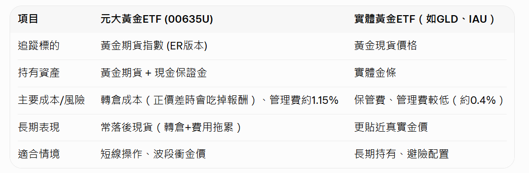 法規與商品設計考量:台灣當時推出原物料期貨ETF時,多數選擇追蹤ER版本的期貨指數(公開說明書提到部分是基於法規要求)。實體黃金需要實物保管、進出口、稅務等複雜問題,期貨方式操作相對簡單、成本較可控。