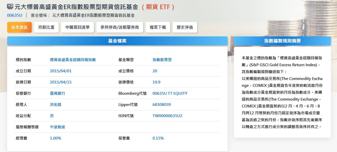 元大黃金ETF(00635U,全稱:元大標普高盛黃金ER指數股票型期貨信託基金)追蹤的是「標普高盛黃金超額回報指數」(S&P GSCI Gold Excess Return Index),這是一個期貨指數,不是直接追蹤黃金現貨價格。